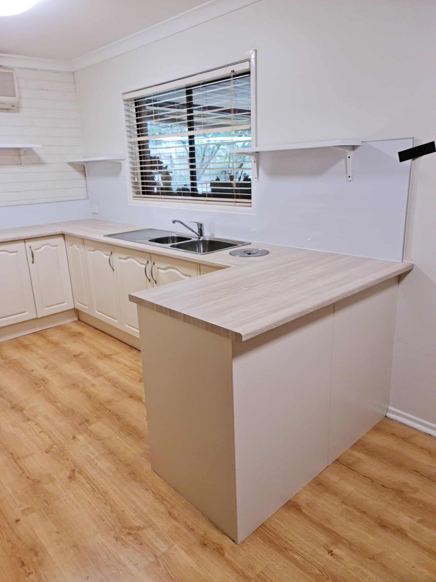 Our client wanted to modernise there existing kitchen and opted for a benchtop and splashback replacement. We removed and replaced of old benchtop with a Laminex Bleached Elm Timber Grain benchtop in Natural with a 10×10 postformed edge profile. We also supplied and installed a Reflections 3mm White Composite splashback. Job duration: 1 day