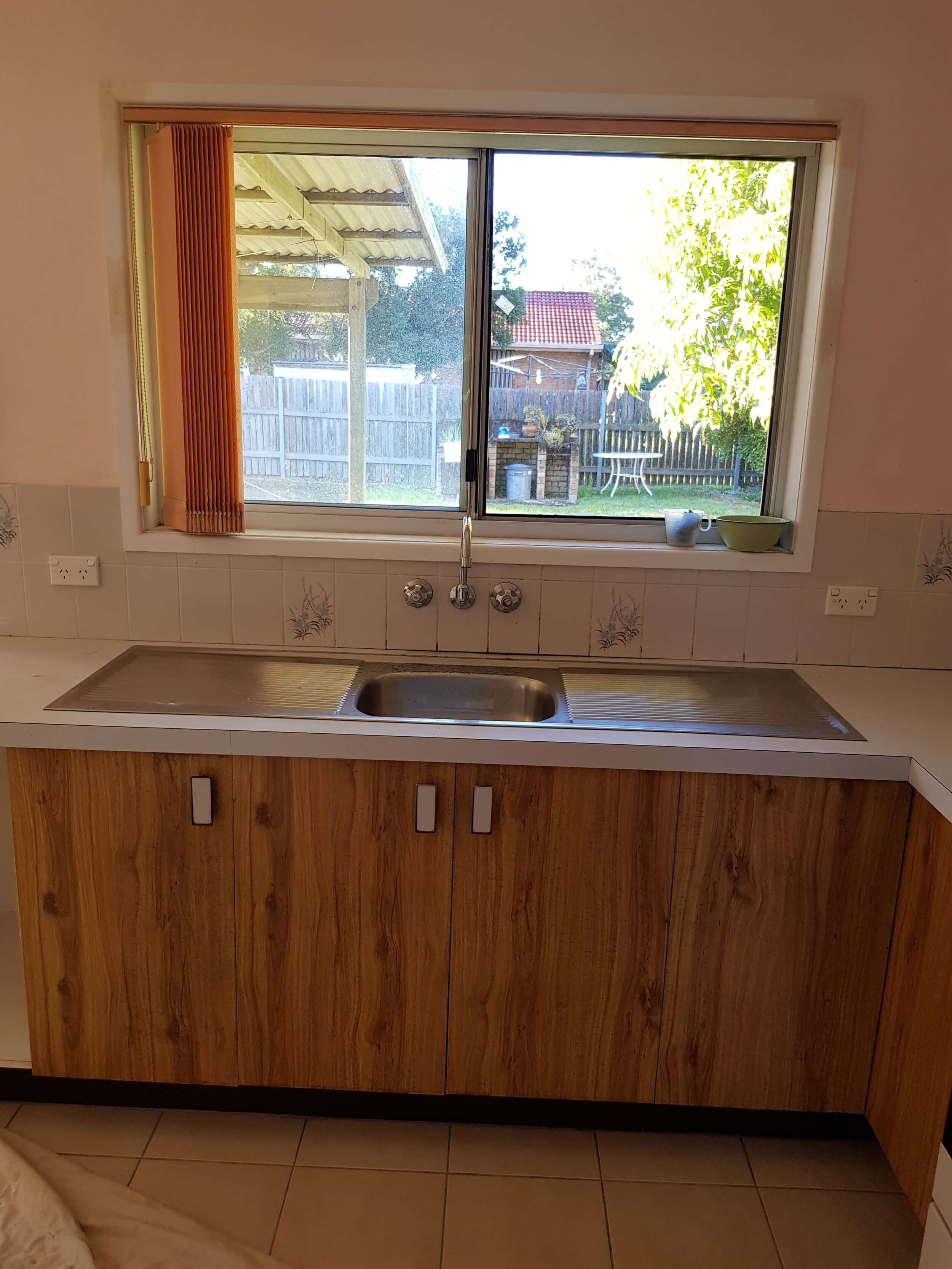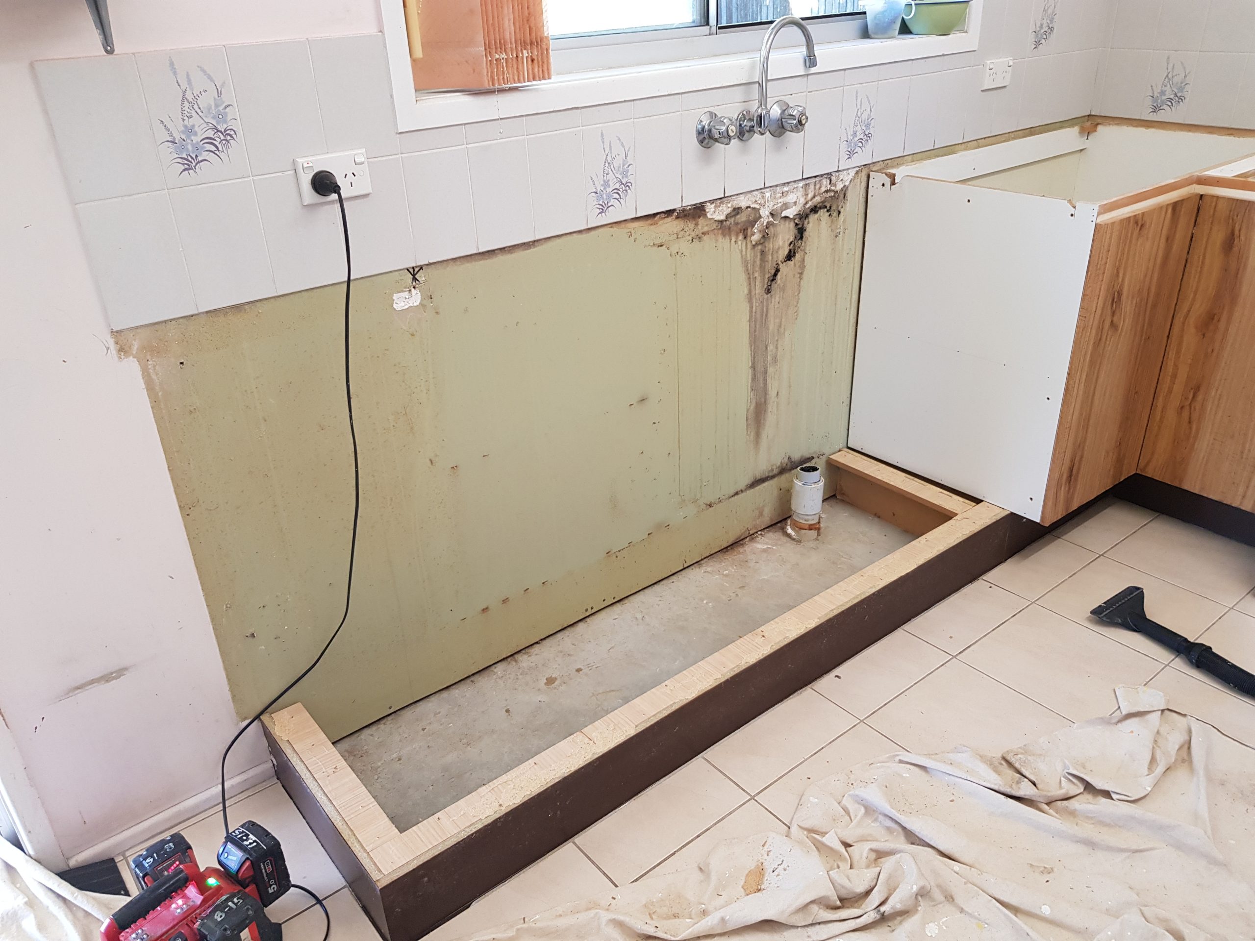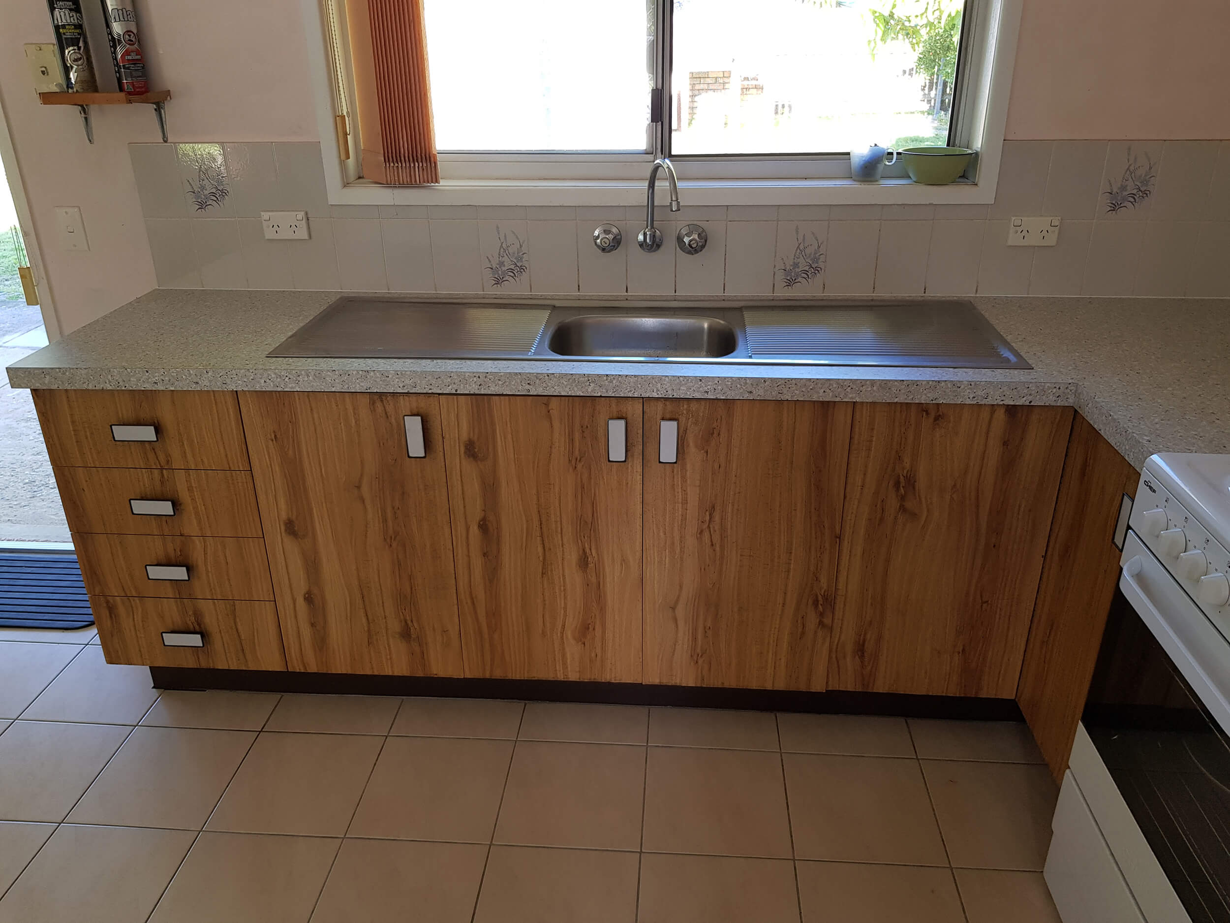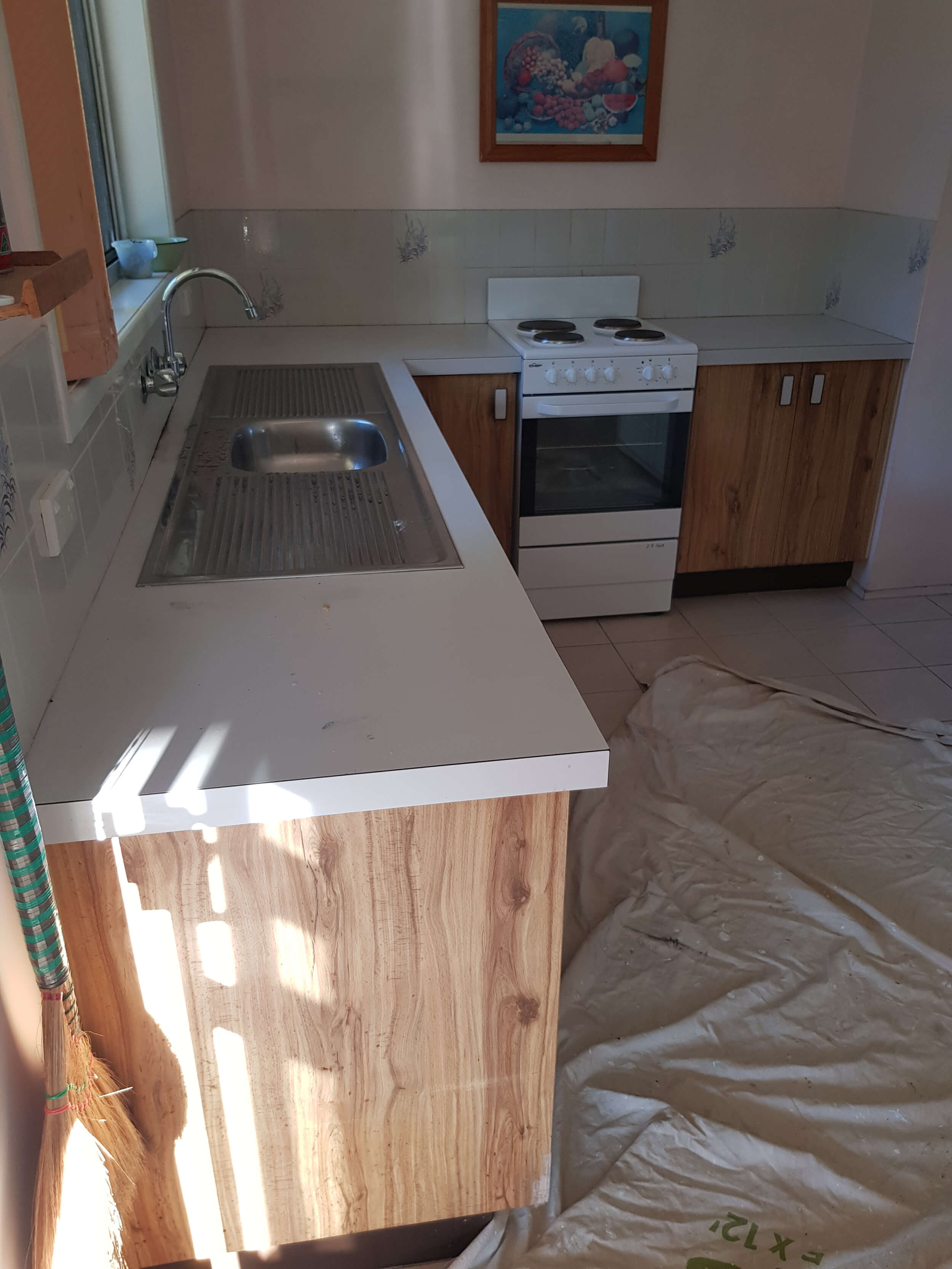 Job scope: Remove and dispose of old laminate benchtops. Supply and install new laminated drop front benchtops with square edge. Project also included removal and replacement of sink cabinet due to long term water damage.