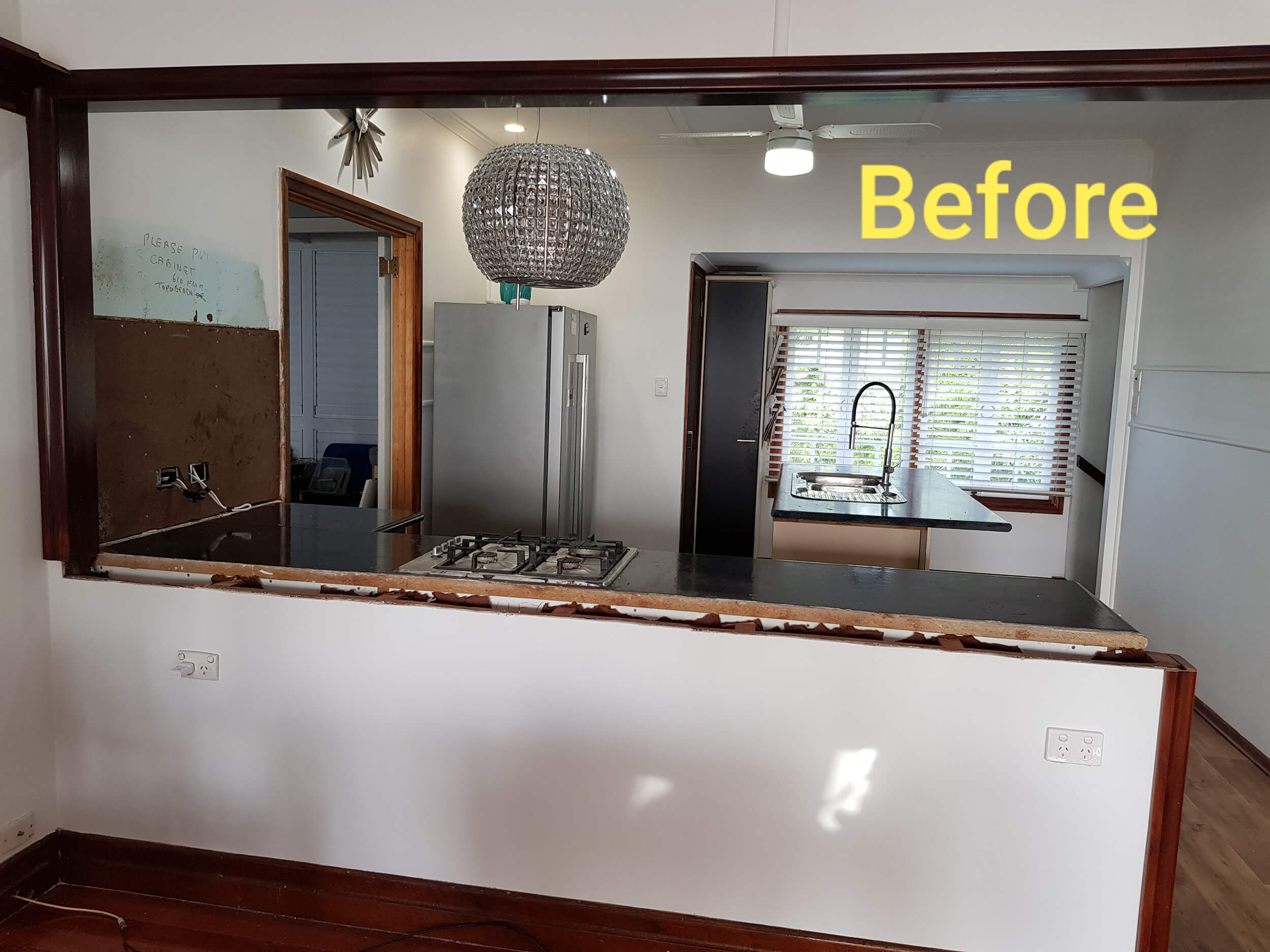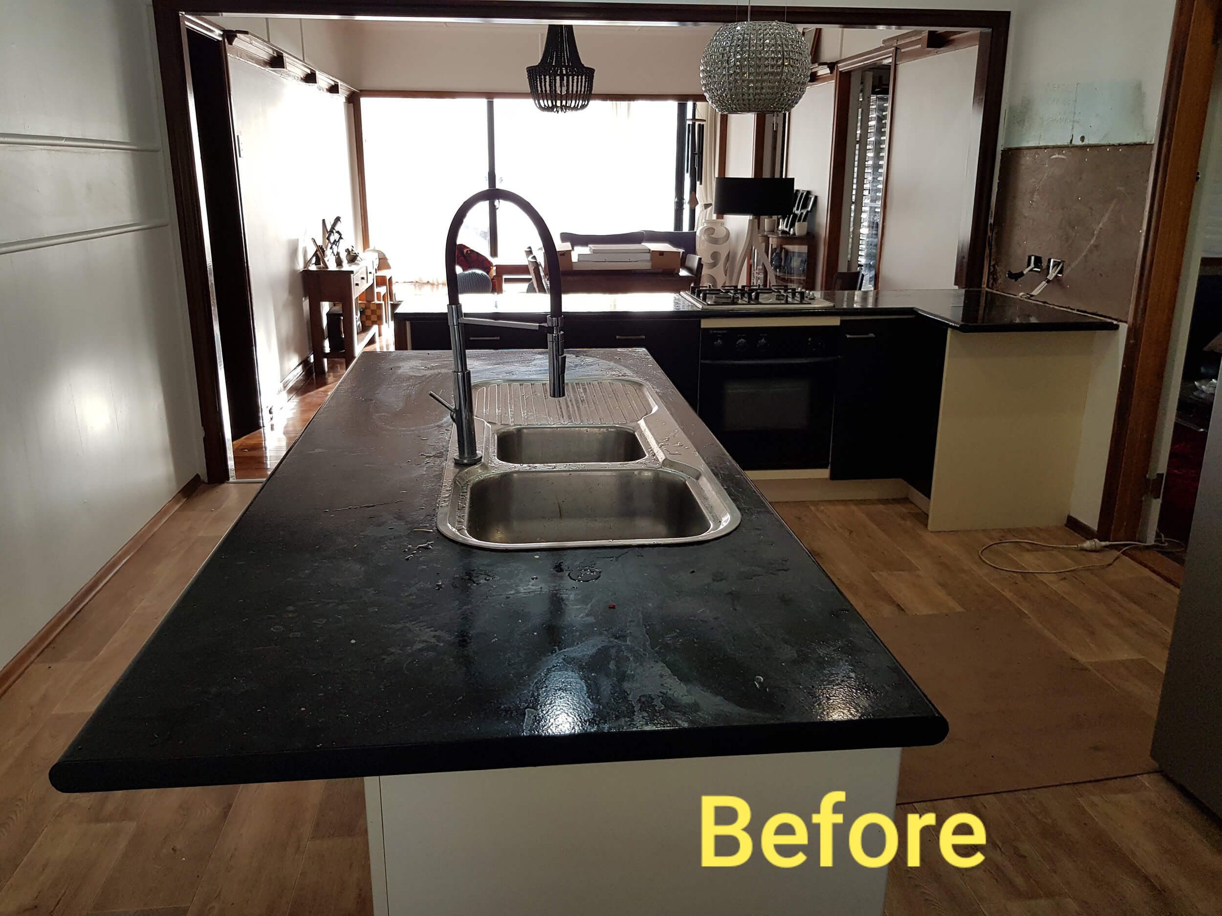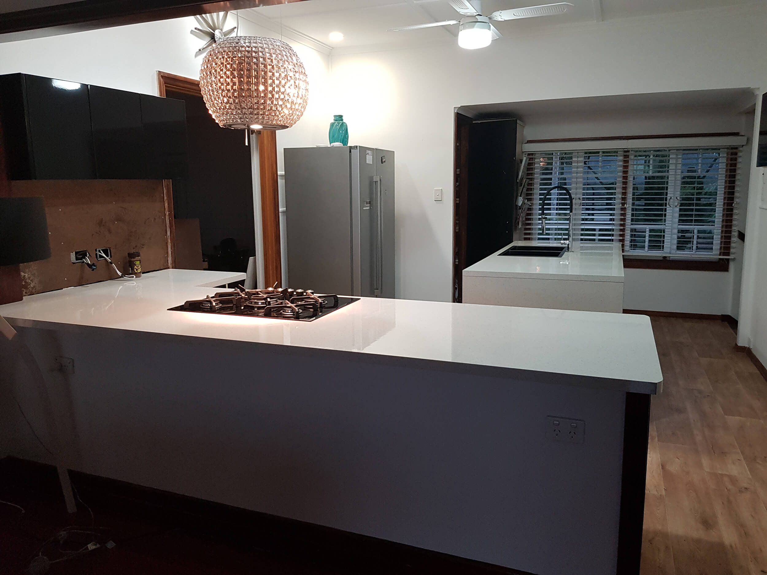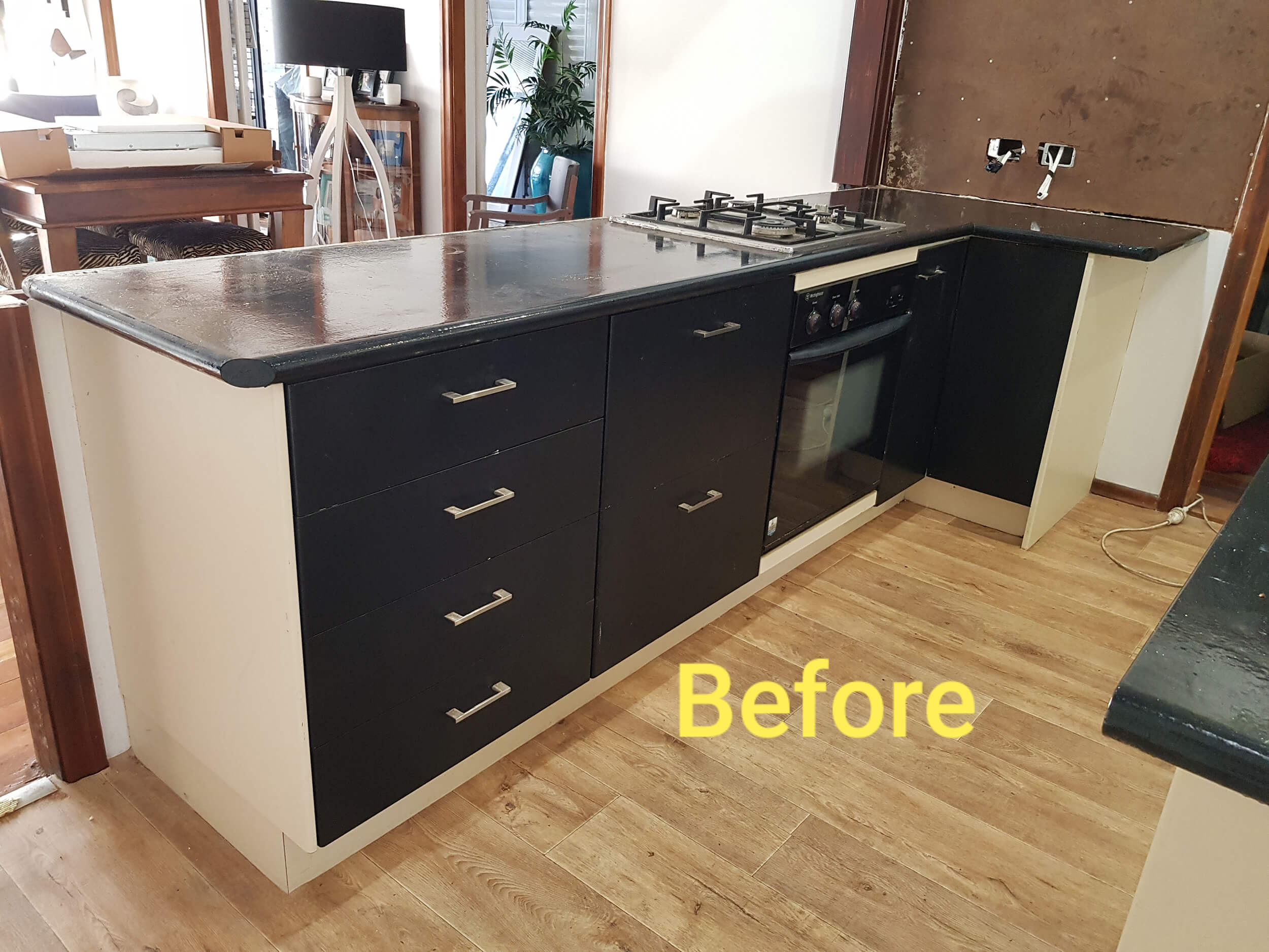 Removal and replacement of benchtops, doors, drawer fronts and panels. Supply and installation of new Gloss Black wall cabinets. Project also a gas fitter/plumber to plumb in new gas cooktop, sink and tapware.